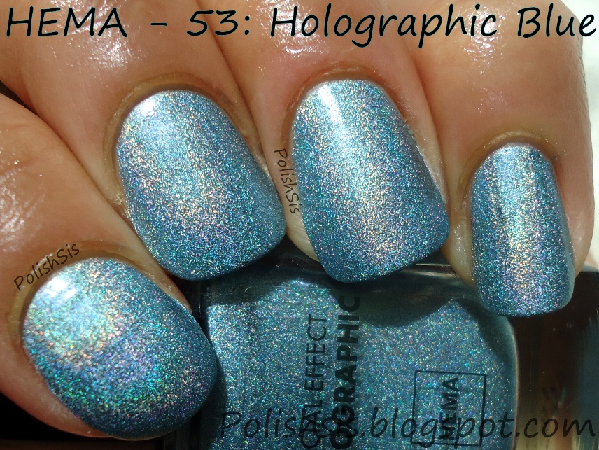 HEMA 53 Holographic Blue is a light blue polish. A very cool toned polish (almost gives me the chills ;-)), I personally would wear this mid winter when it's freezing and snowing. But that is my opinion, I can see this polish being used on lot's of tanned hands and feet this summer. Again a subtle holographic effect, but very noticable in sunlight.